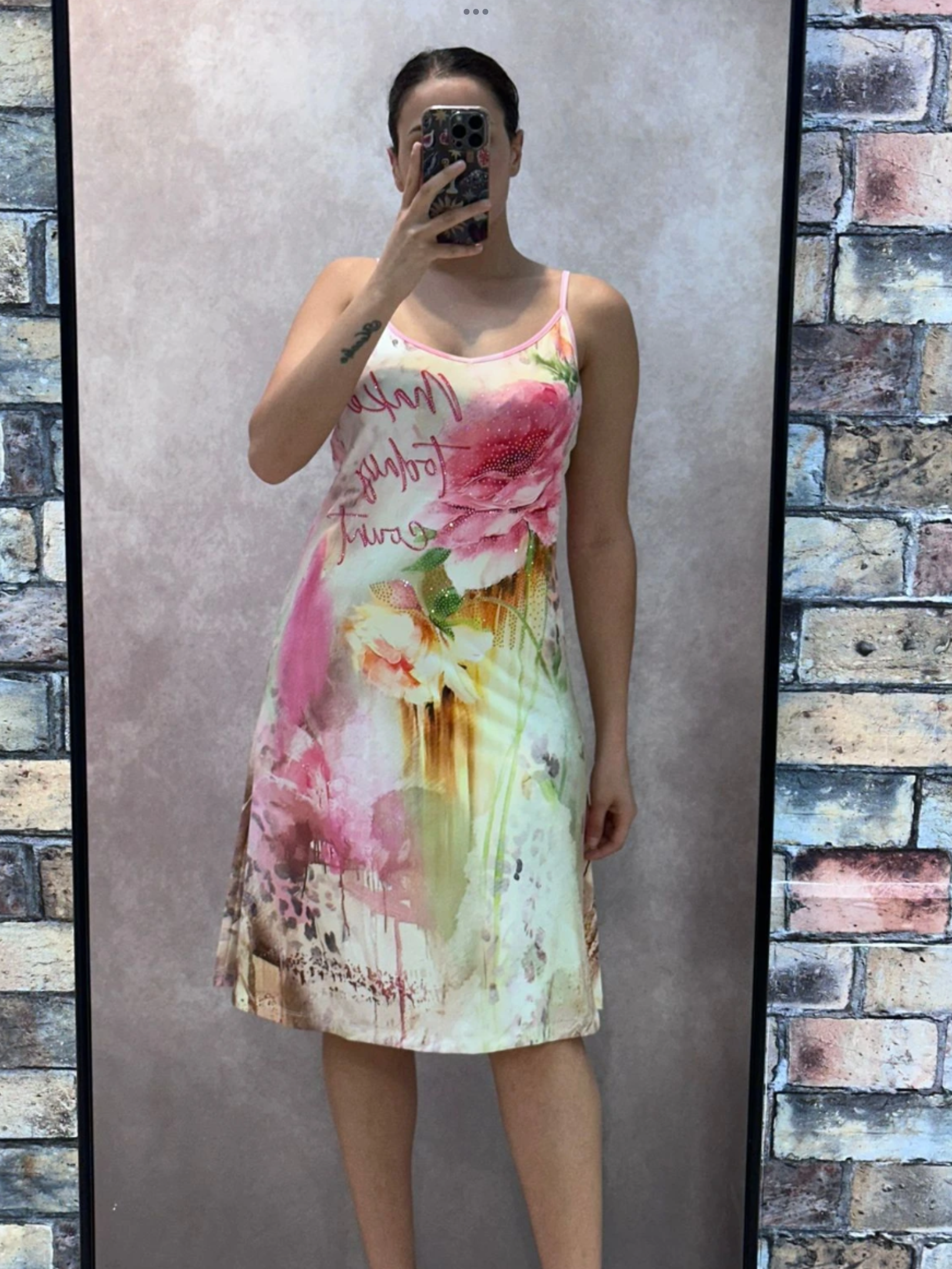 Anan mekko pyöreällä pääntiellä, mustalla pohjalla ajaton kuviointi. Mekossa vuori, joka tuntuu Silkkimäisen pehmeältä iholla. hieman vajaamittaiset trumpettihihat. Päällinen hyvin joustavaa kangasta. Ei hiosta! Muotoon ommeltu.