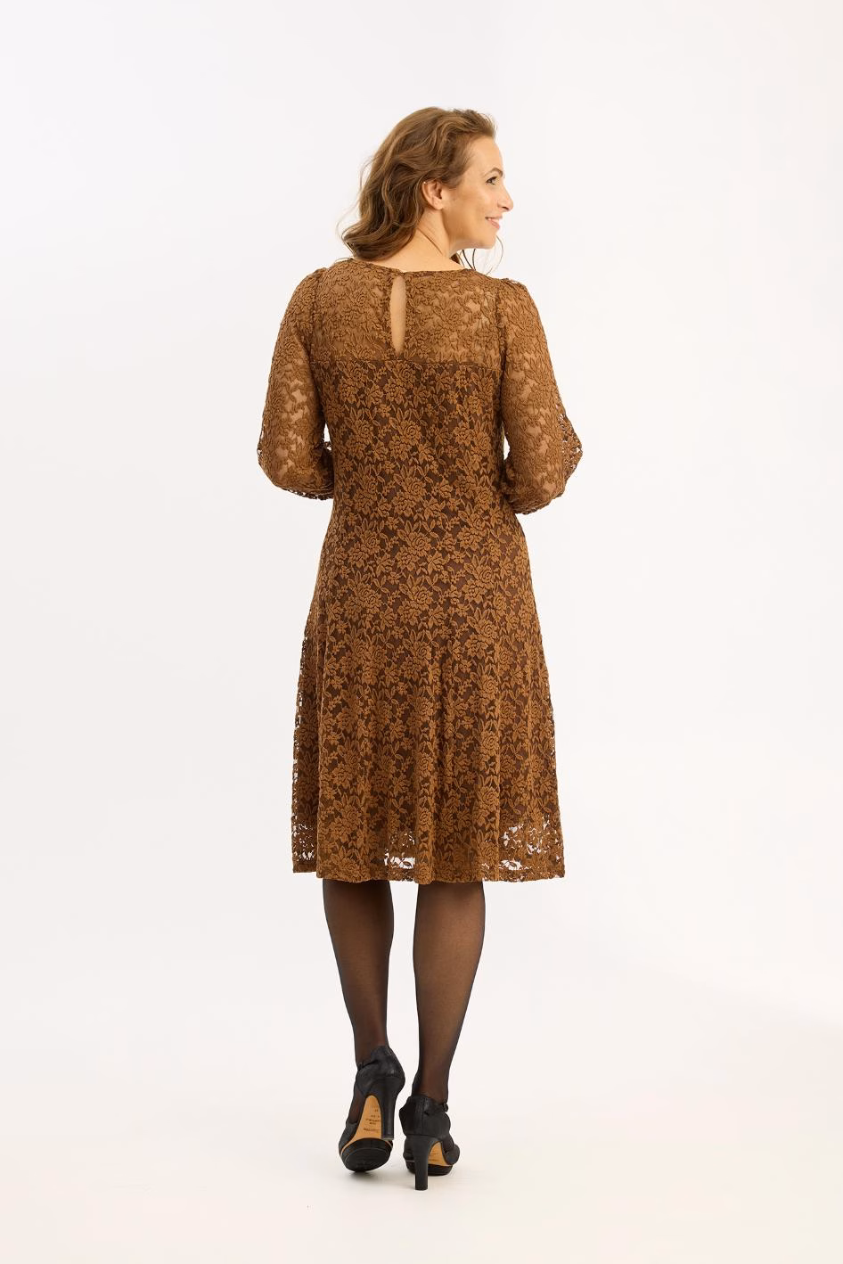 Naisellinen pitsimekko, joka sopii upeasti juhliin kuin juhliin. Päällinen on joustavaa pitsineulosta. Mekossa on bodyn kohdalla joustava trikoovuori. Pitkät hihat ja ranteissa kuminauhat. O-pääntie, niskassa avattava nappi. Mekko on kauniisti tyköistuva ja helmaa kohti levenevä. Vuori on 6cm lyhyempi kuin päällinen.