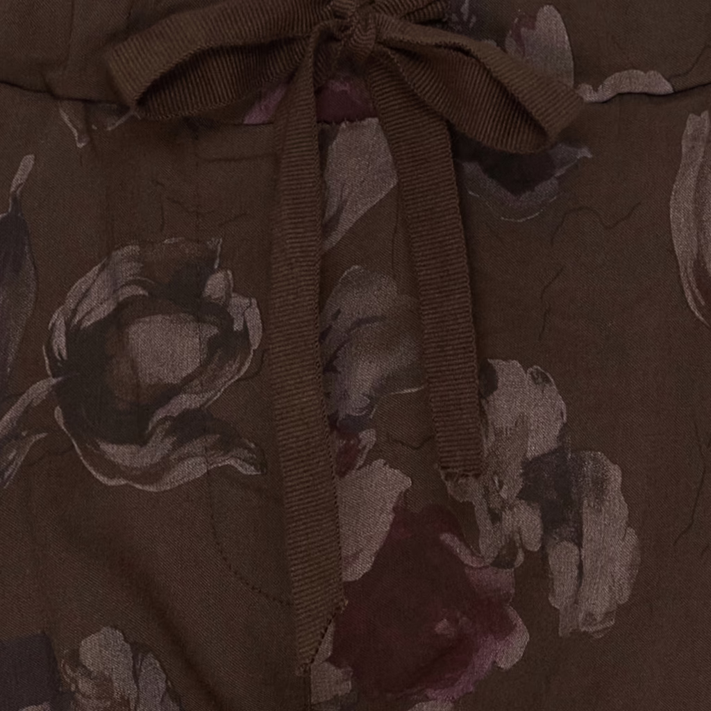 Tumman ruskea, kukkakuosi. Erittäin joustavat! 65% Viscose 30% Nylon 5% Elastan