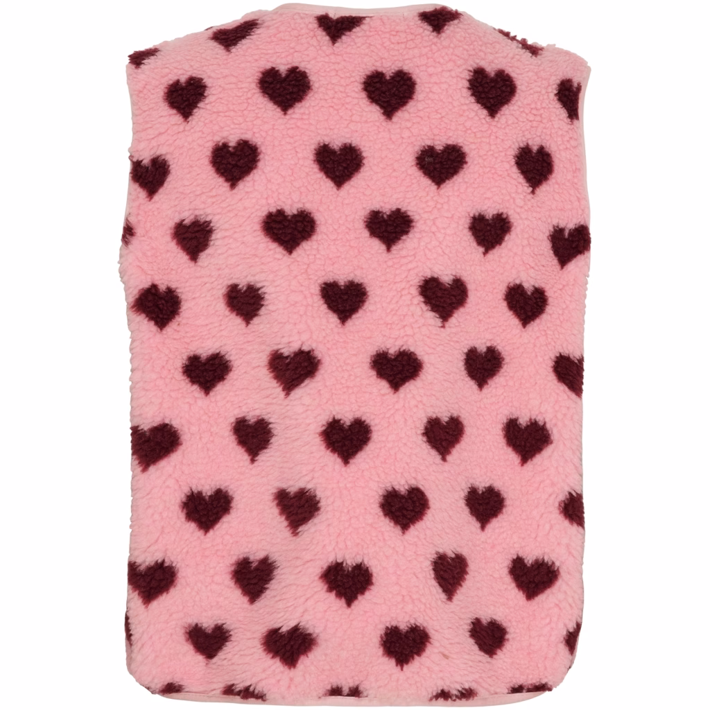 Martan söpö teddyliivi. Edessä napit. Vaaleanpunaisella pohjalla viininpunaiset sydämet.