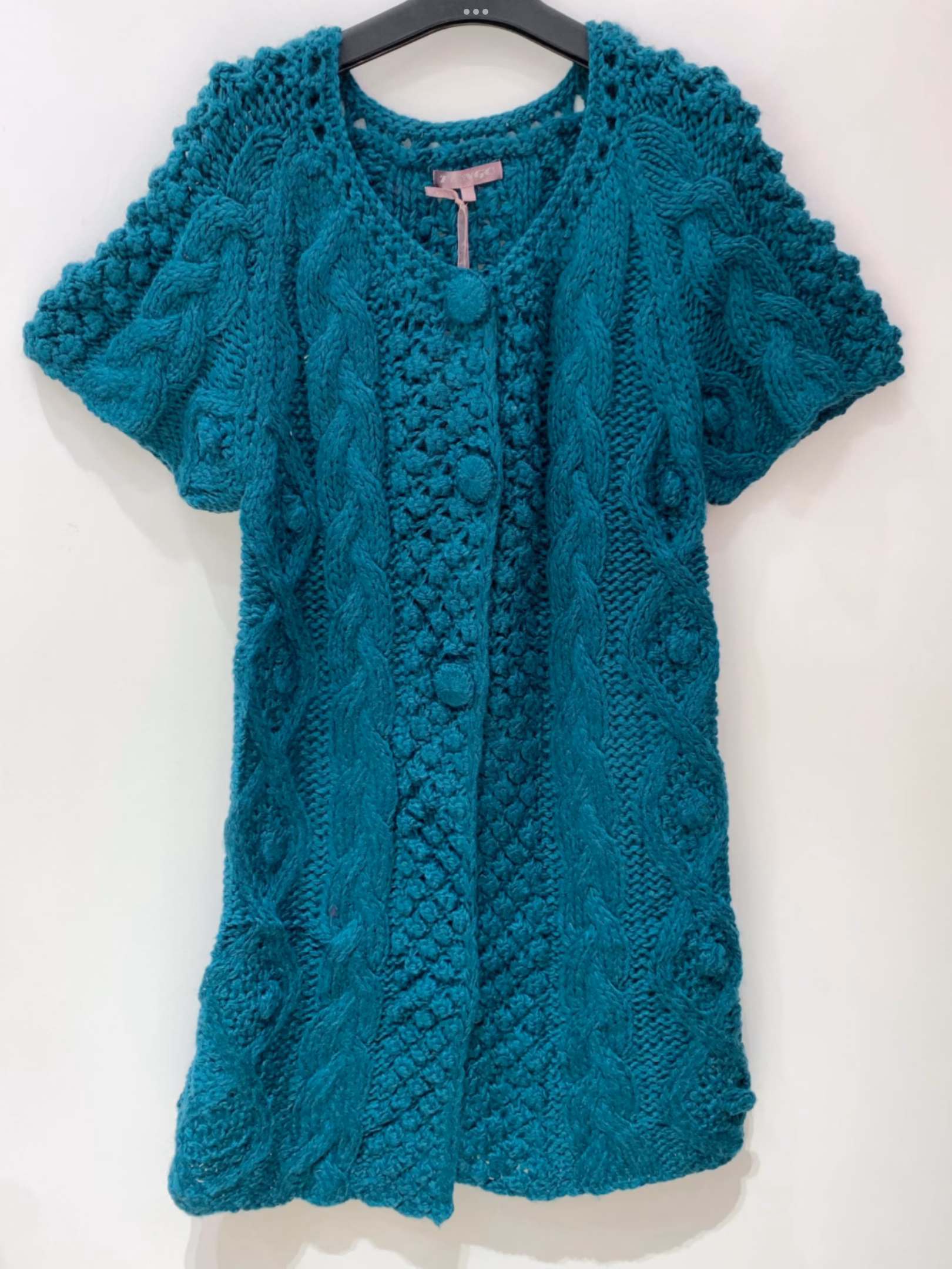 Reilun pituinen Neulehuppari taskulla. Yhden koon, kai-kai 69cm, pituus 81cm. Mitat venyttämättä eli venyy koska neulosta.